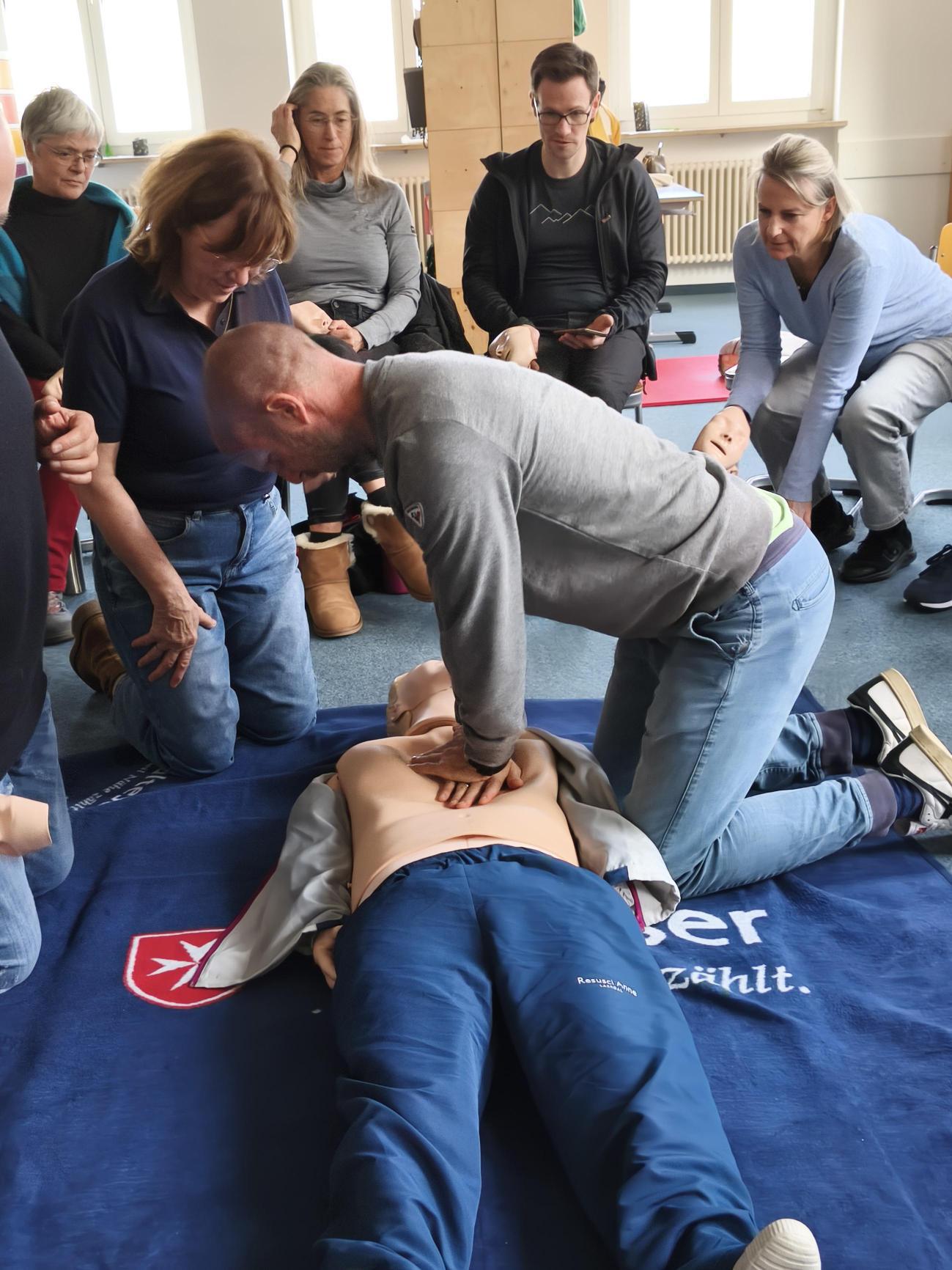 Deshalb haben über 20 Lehrerinnen und Lehrer am unterrichtsfreien Buß- und Bettag einen Erste Hilfe-Kurs durch den Malteser-Hilfsdienst absolviert und sich intensiv (auch mit aktiven Übungen) auf Situationen, wo akute Hilfe nötig ist, vorbereitet.