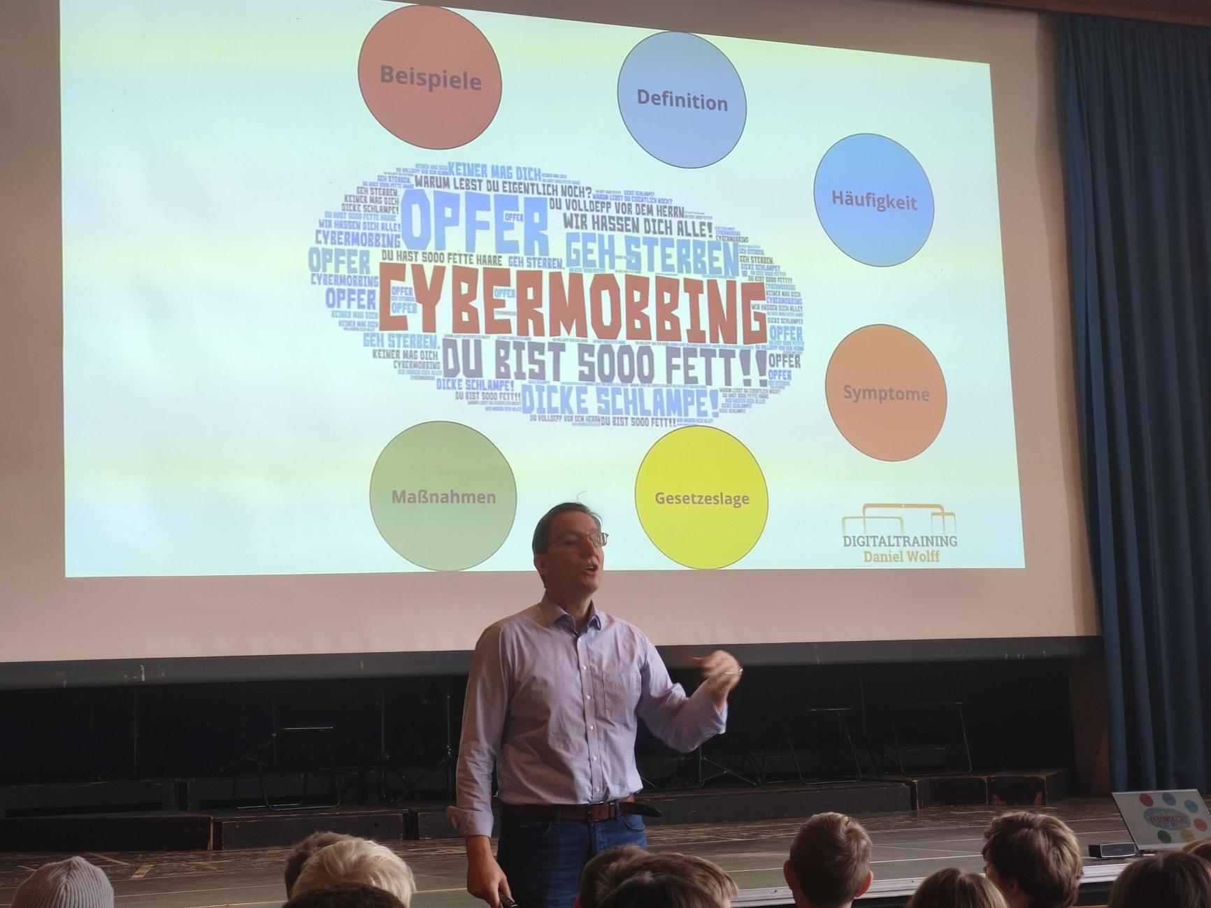 Vorher allerdings gilt es, die Fallstricke beim Chatten auf social media genau zu kennen. Hierzu hat Daniel Wolff von „Digitaltraining“ allen einen eindrucksvollen Vortrag geboten, der eindringlich die Gefahren des Cybermobbings thematisiert hat. Als Begleiter der 5. Klassen bei den weiteren Schritten in die digitale Welt wird er einen Nachfolge-Workshop im Januar geben und dann auch die (gesamte) Elternschaft am 29.1. abends in einem Video-Vortrag adressieren.