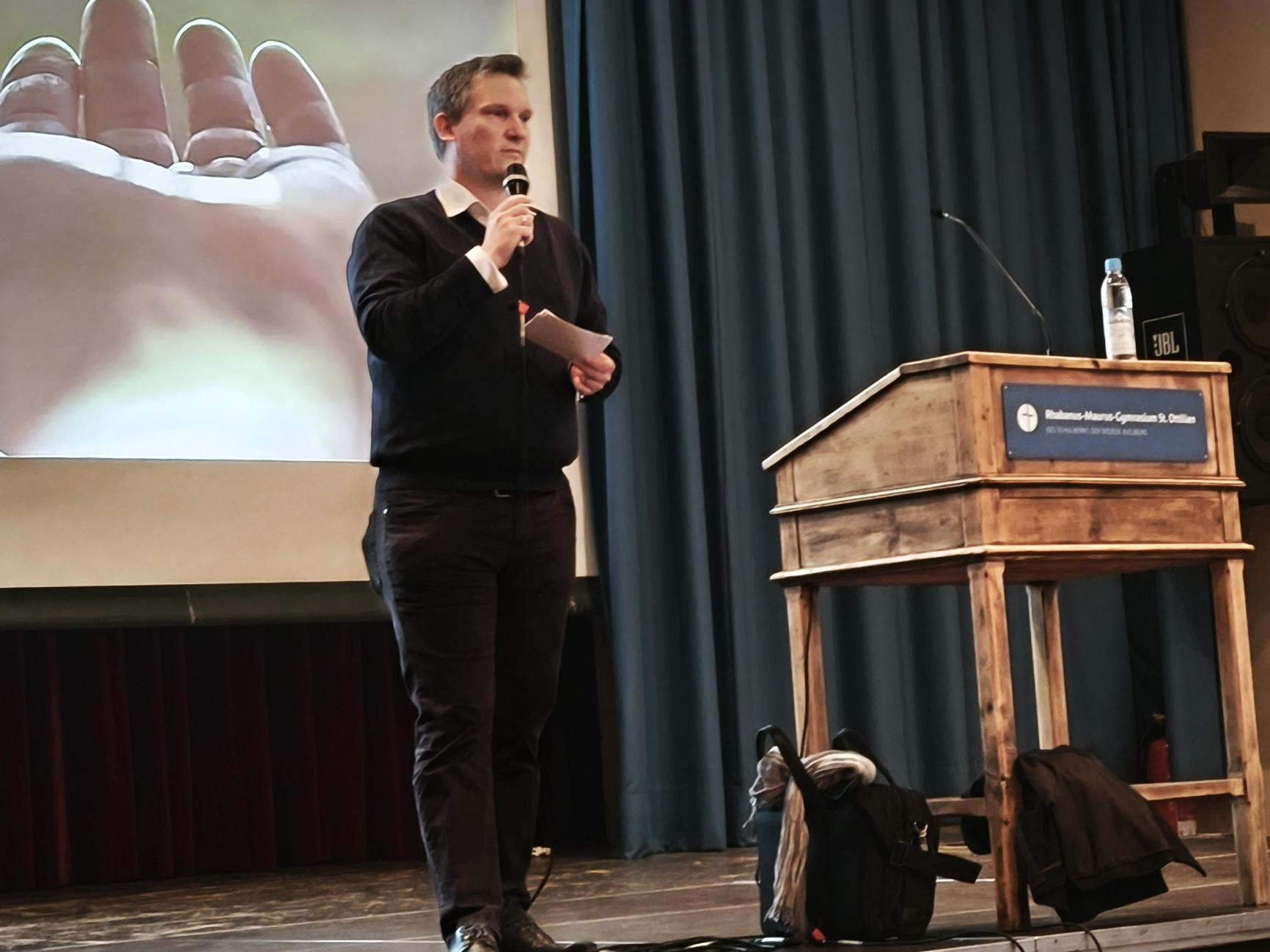 Am 29. und 30.November besuchte ein Zeitzeuge, der damals in der DDR aufgewachsen ist und viele Geschehnisse dort miterlebt hat, unsere Schule. Die von der Hans-Seidel-Stiftung organisierte Veranstaltung dauerte 1 1/2 Stunden und wurde zu unterschiedlichen Zeiten von den 10. 11. und 12. Klassen besucht. In spannenden Vorträgen berichtete er, wie das Leben in der DDR ablief und erzählte anhand seiner eigenen Kindheit und Jugend, wie Menschen manipuliert wurden. Mit Bildern und Videos unterstützte er seine Erzählungen. Alles in allem wurde die Idee und Umsetzung sehr positiv aufgenommen.